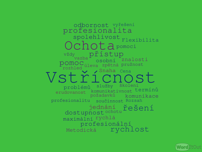 Odbor analýz a podpory řízení Krajského úřadu Kraje Vysočina pořádal dotazníkové šetření spokojenosti příspěvkových organizací s prací PKKV. Respondenti výzkumu odpovídali na širokou škálu otázek. Otázky byly zaměřeny na hodnocení spolupráce s PKKV, kvalitu poskytovaných služeb nebo dostupnost a srozumitelnost poskytovaných informací. Zajímalo nás také, jaké doporučení k budoucím změnám a výzvám nám naši klienti dávají. Výsledky průzkumu nás velmi potěšily a slova, která nejvíce dle klientů vystihují naši činnost, si můžete prohlédnout v přiložené grafice.